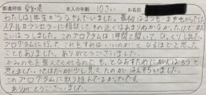 しかし、回を重ねるごとに娘の成長を感じ、それとともに改善もみられ、大変 有意義なものでした。卒業を目前に「再発」という不安もありますが、娘を信じ、見守っていこうと思います。