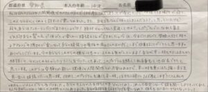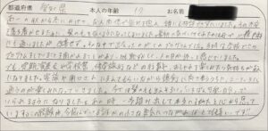 長い事抜毛していて、髪をずっとむすんでいないといけなかったけど、K’sマダムできれいにしてもらって、やめるきっかけを作ってもらえたので、なおすことが出来て、大学生っぽい髪型にもできるようになったし、もう抜かないようにしようと思いました。行ってよかったし、感謝しています。