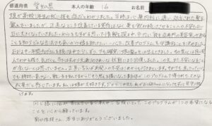 ご本人とお母様からの感想文でもふれていますが、プログラム開始当初は、基本を正しく取り組む事が出来ず苦しい時期がありました。