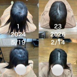 最初は驚くほど髪が生え、目に見える変化で嬉しくて頑張ろうという気持ちでいっぱいでした。しかし、一番沢山抜毛していた前髪は生えるのが遅く変化を感じる事が減り、モチベ(モチベーション)が下がってきました。その時「ここで一からやり直すのは嫌」と思い、初回時と最新時の髪の画像を送ってもらい「ここまで自分は頑張った」と自身を褒めてモチベ(モチベーション)を上げました。